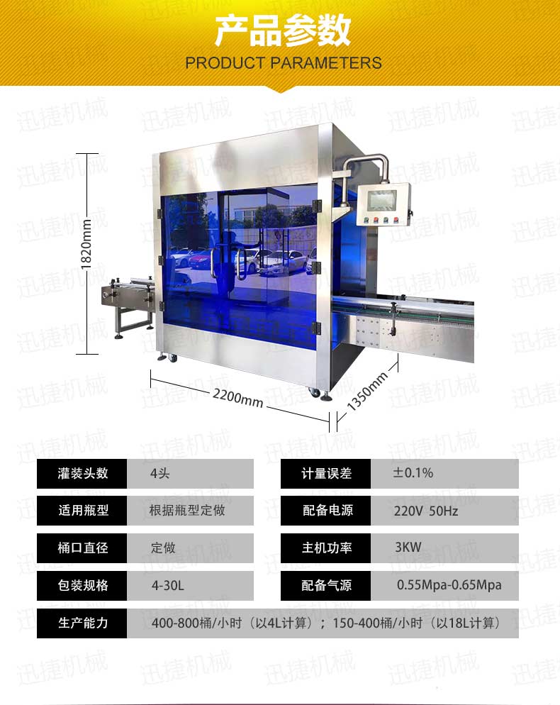 機油灌裝機適用于對4kg-25kg汽車用品類產品:潤滑油、防凍液、車用尿素等液體灌裝。自動完成計數進瓶、計重量灌裝、輸送出瓶等一系列操作。