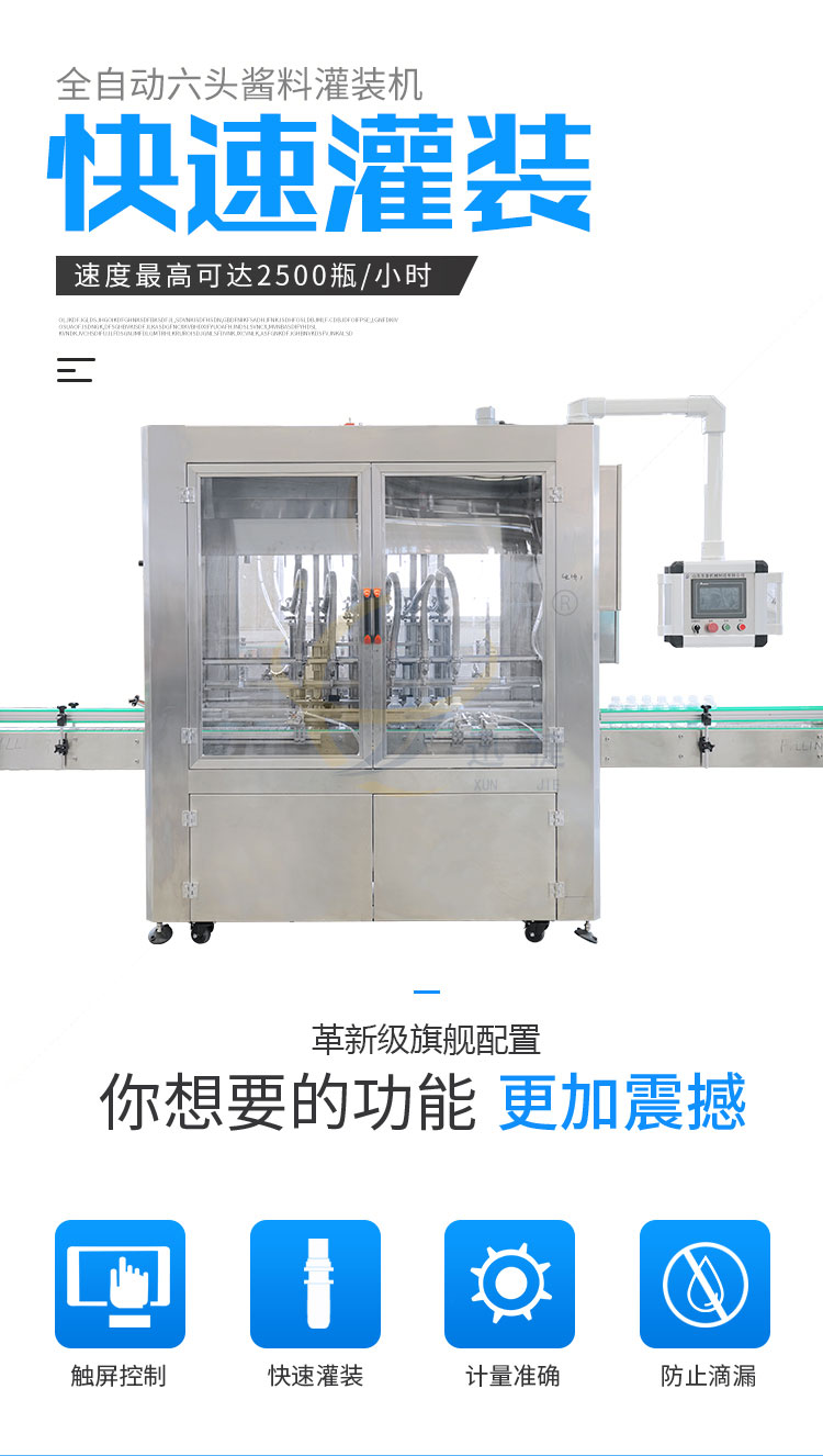 全自動醬汁灌裝機可實時根據不同產品做出不同的調整,操作方便,內置各種配方一鍵保存讀取。傻瓜式操作界面。