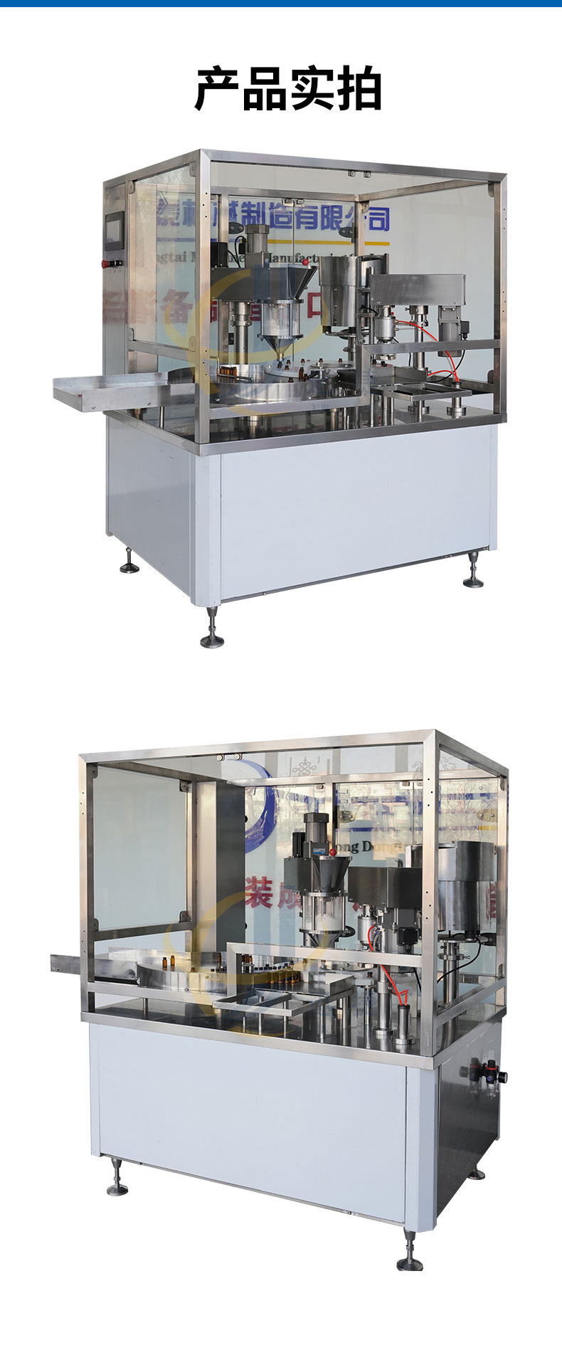 全自動粉劑灌裝旋蓋一體機適用于微量類面粉粉劑灌裝。人工進瓶,設(shè)備自動進瓶,自動定量灌裝,自動旋蓋。PLC觸屏控制。