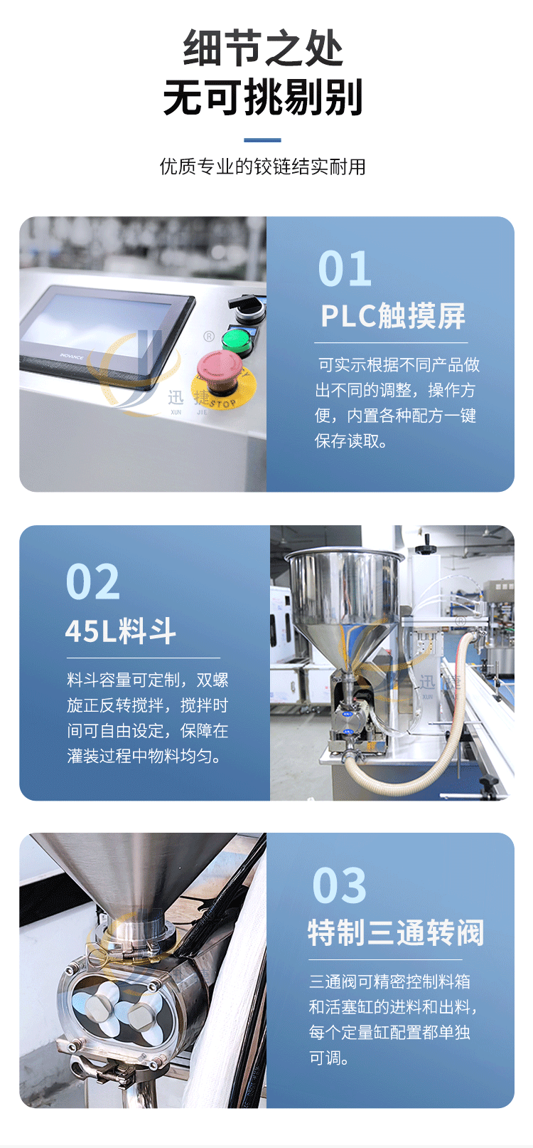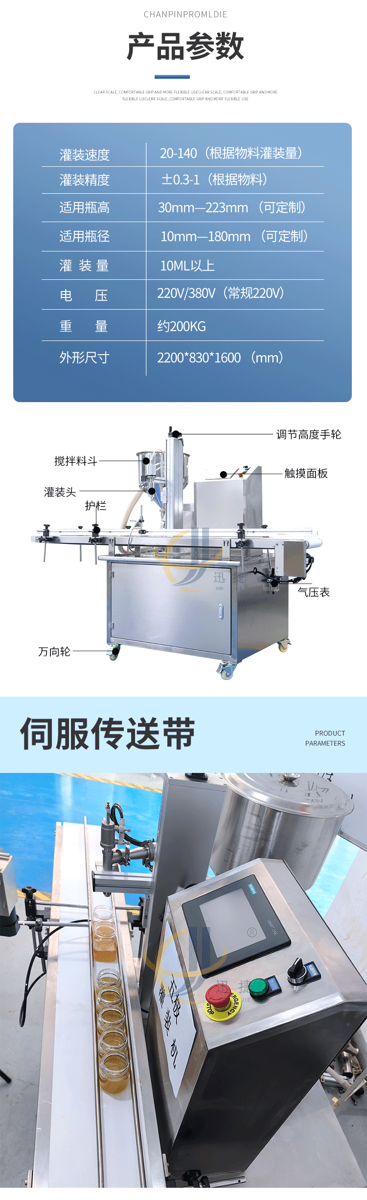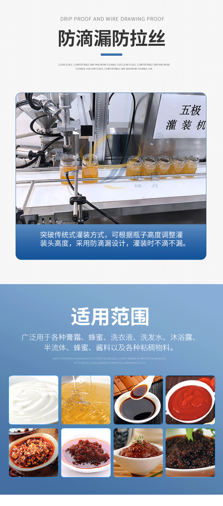 五極灌裝機(jī):極快-單頭2200瓶/時 極簡-操作簡單 極廣-啥啥都能灌 極穩(wěn)-24小時不停機(jī) 極準(zhǔn)-200g誤差小于1g。它可以和真空旋蓋機(jī)搭配使用。