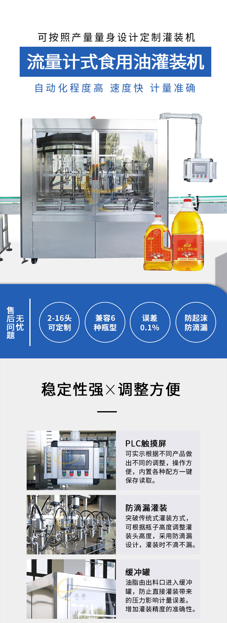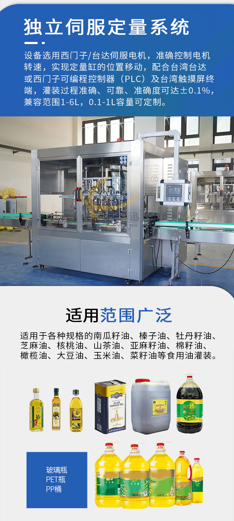 流量計食用油灌裝機適用于亞麻籽油、菜籽油、大豆油、芝麻油、橄欖油、花生油、玉米油、山茶油等食用油灌裝。