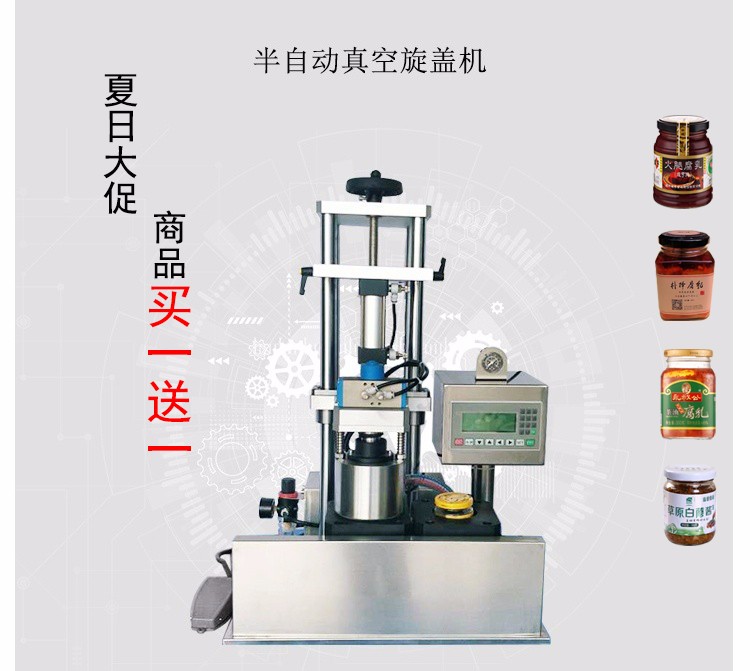 這款小型辣椒醬封口機主要用于食品包裝,采用標準馬口鐵爪式旋開蓋封口的玻璃瓶包裝。可實現的功能是抽吸包裝容器內的空氣使其達到設定的負壓值(即抽真空),然后旋緊蓋子。 為半自動機型,即人工進出瓶,人工配蓋,其他過程自動。